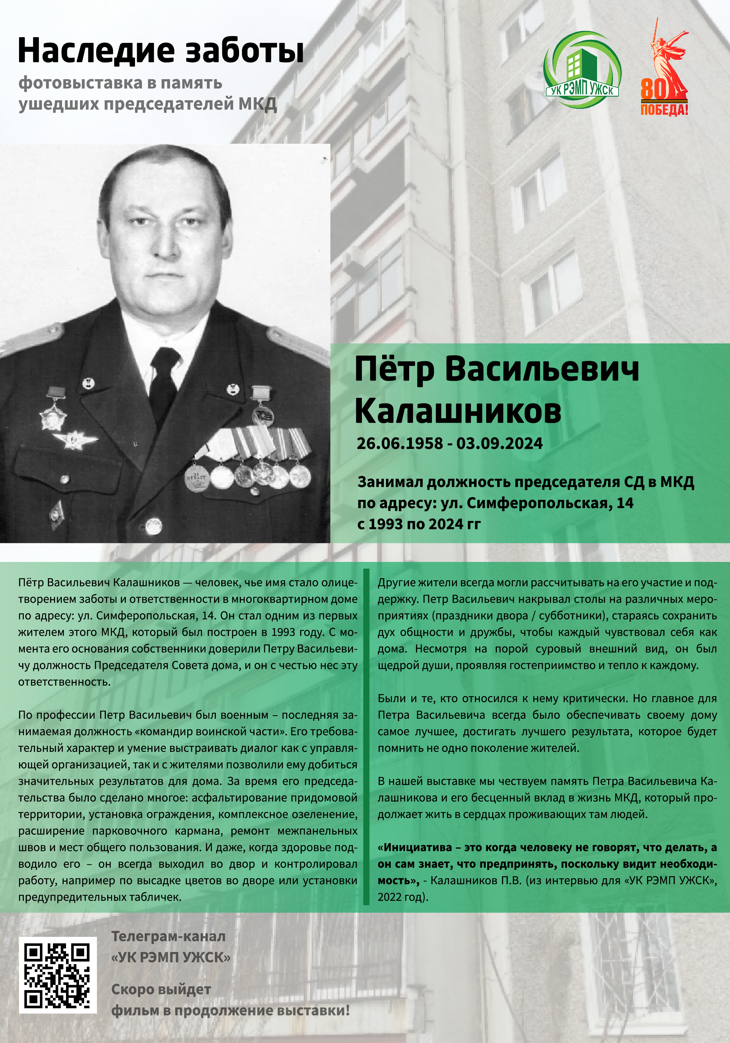 В нашей выставке мы чествуем память Петра Васильевича Калашникова и его бесценный вклад в жизнь МКД по адресу: ул. Симферопольская, 14, который продолжает жить в сердцах проживающих там людей.