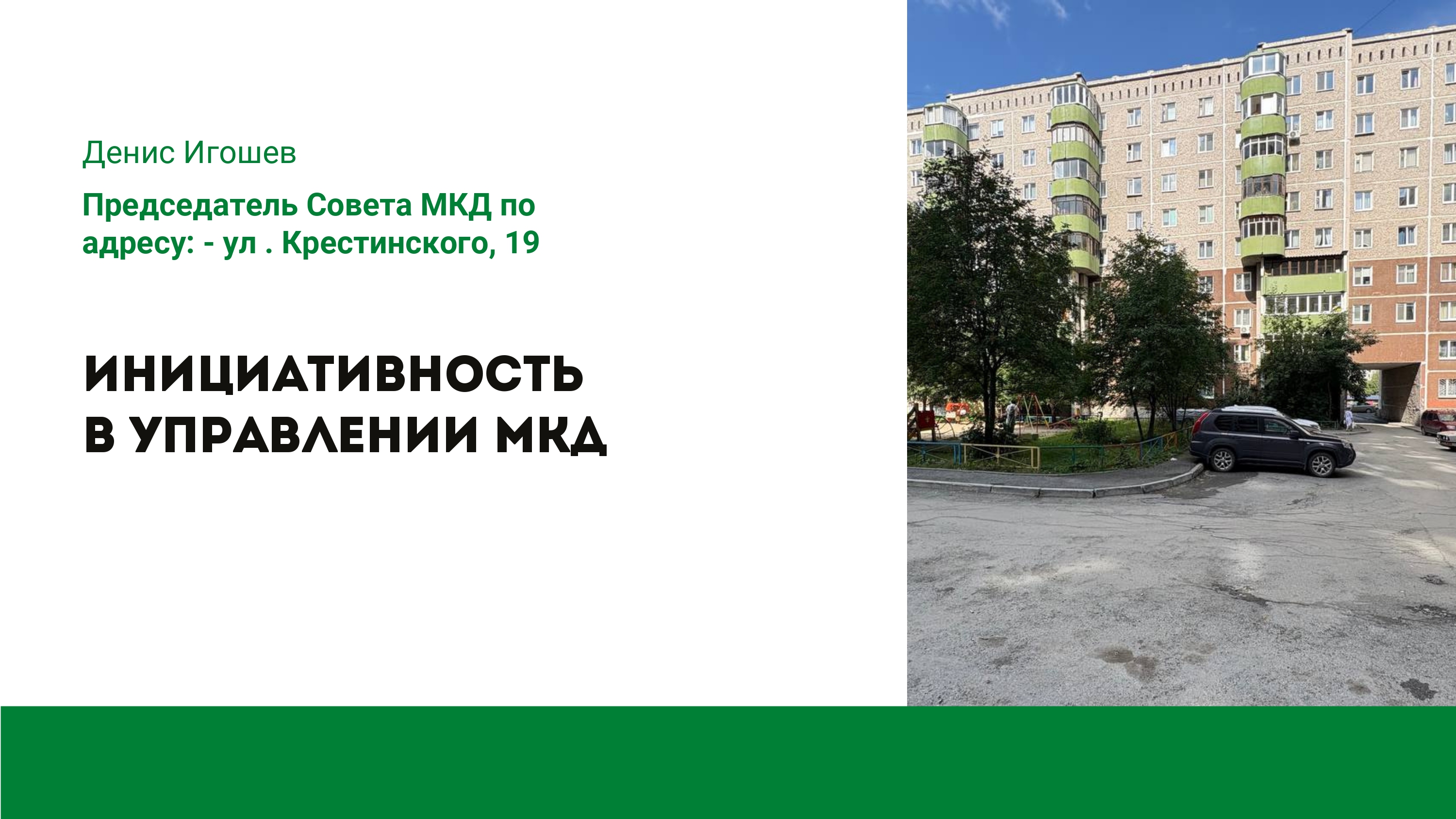 Денис Александрович Игошев более 10 лет является председателем совета многоквартирного дома по адресу – ул. Крестинского, 19. Многому по теме управления дома он научился у своего предшественника – Виктора Дмитриевича Серебрякова, который с момента постройки дома заботился о нём, как о своём.