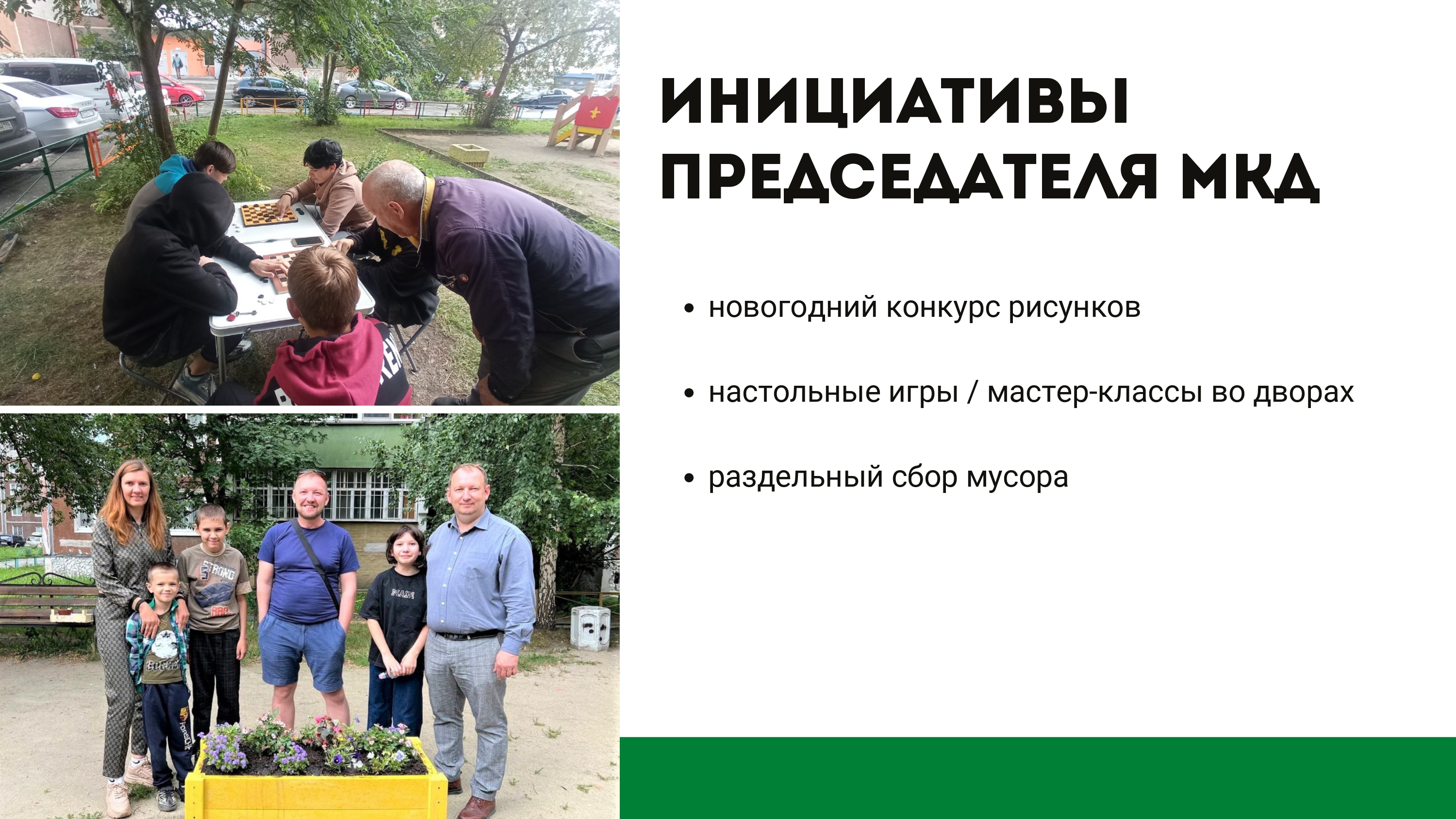 На должности председателя Денис Александрович реализует собственные инициативы на благо жителей. Например, ежегодно Совет дома проводит новогодний художественный конкурс для детей с вручением сладких подарков, а также уже 2 года они организуют и проводят настольные игры во дворе для взрослых и детей, и активно призывают всех жителей к раздельному сбору мусора с последующей монетизацией.