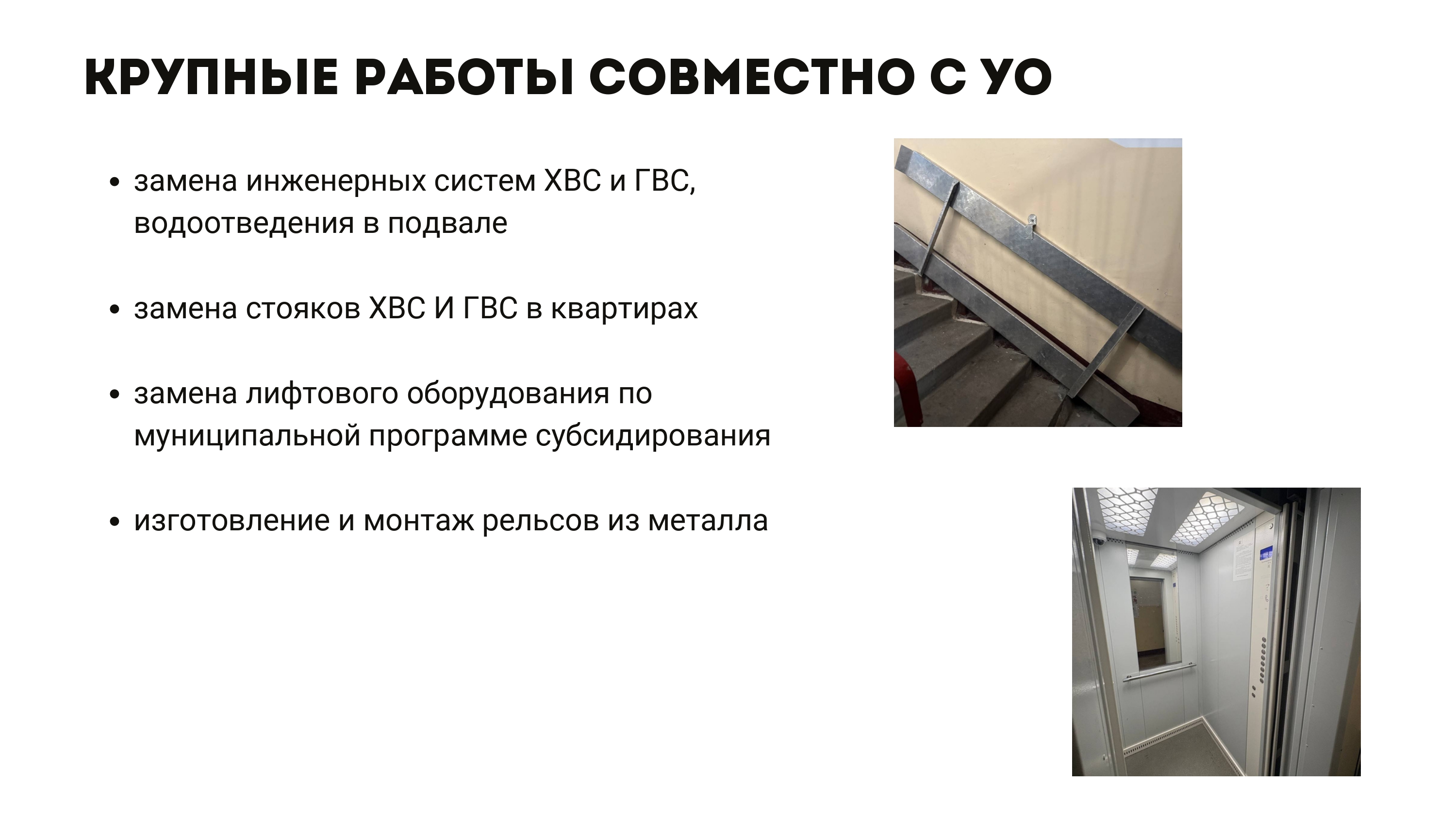 За время работы с управляющей организацией «УК РЭМП УЖСК» было сделано немало важных работ для дома: замена инженерных систем ХВС и ГВС, водоотведения в подвале, замена стояков ХВС И ГВС в квартирах, которое было проведено в сложное время «пандемии» - на всех этапах работы обе стороны слышали друг друга и итогом стала своевременно выполненная работа. Также провели большую работу по замене лифтового оборудования. В 2023 году заменили 2 лифта, в этом году проголосовали за замену еще 3-х. Замену удалось осуществить с помощью участия в муниципальной программе субсидирования, где часть суммы работ финансирует город.